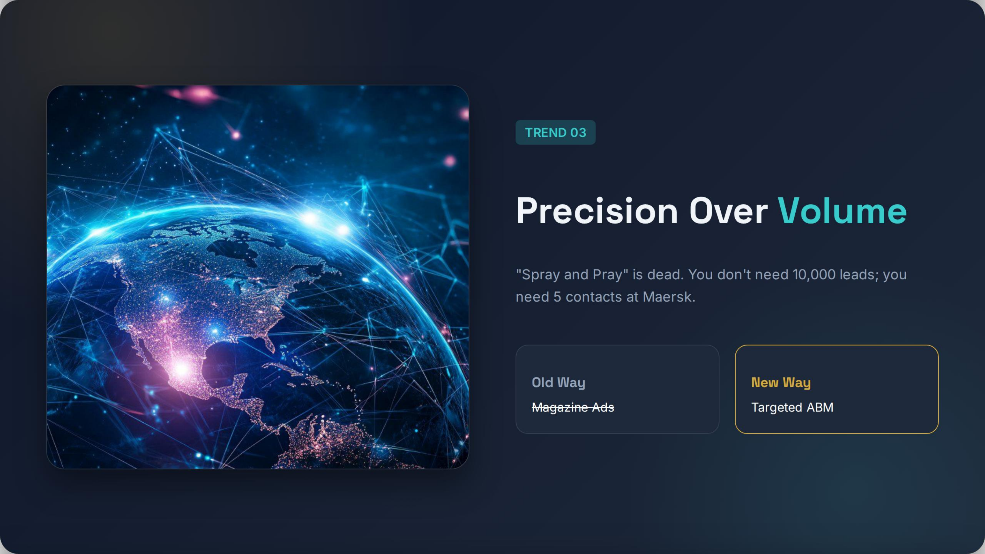 The third trend defining 2026 is the wholesale abandonment of broad-spectrum advertising in favor of Account-Based Marketing (ABM). The maritime procurement landscape has become highly consolidated and digitized, rendering traditional "spray and pray" marketing tactics—such as general magazine ads and untargeted email blasts—obsolete.